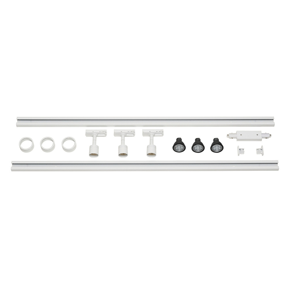 Naast de lampen bevat het set 2 rails en accessoires zoals decoratieve ringen, eindkappen en connectoren. De installatie is eenvoudig en probleemloos dankzij het meegeleverde systeem van hoogspanningsrails. De rails meten 100 x 3,5 x 1,8 cm en de lampen hebben een diameter van 5 cm.