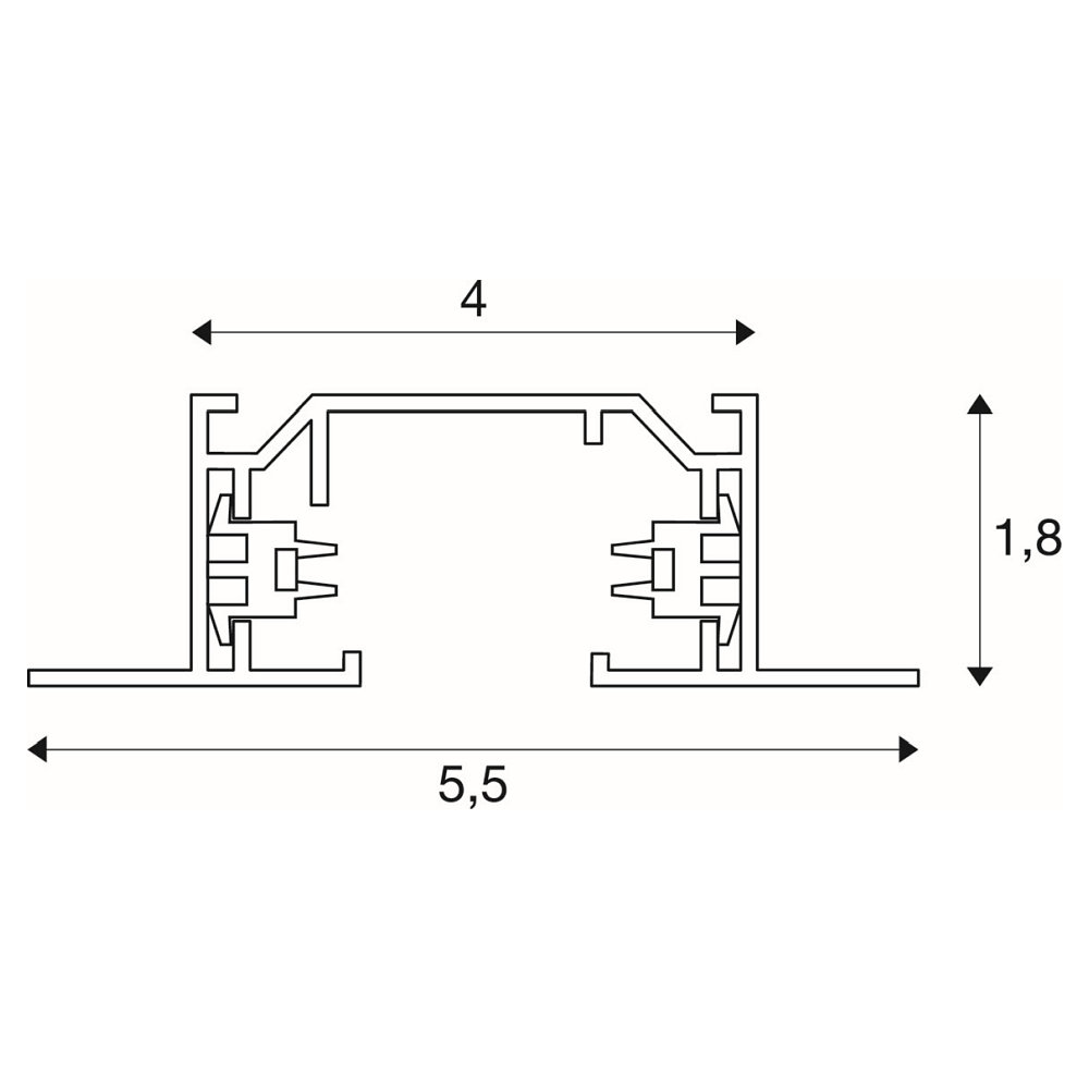 The visible track width is 5.5 cm with a height of only 0.2 cm, ensuring an unobtrusive appearance. The overall dimensions are 200 cm in length, 5.5 cm in width, and 1.8 cm in height. The maximum ceiling material thickness must not exceed 1.4 cm to guarantee optimal installation. Weighing 1.207 kg, the track is easy to handle and simple to install.