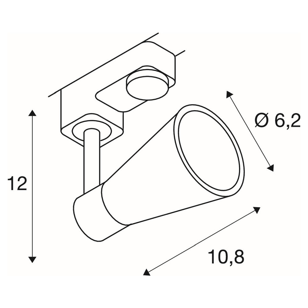 Het zichtbare deel van de railspot heeft een diameter van 6,2 cm, een lengte van 10,8 cm en een hoogte van 12 cm. Het is dimbaar en heeft een draaihoek van 350°. De werkspanning is 220-240V~, en het gewicht van de railspot is 0,209 kg.