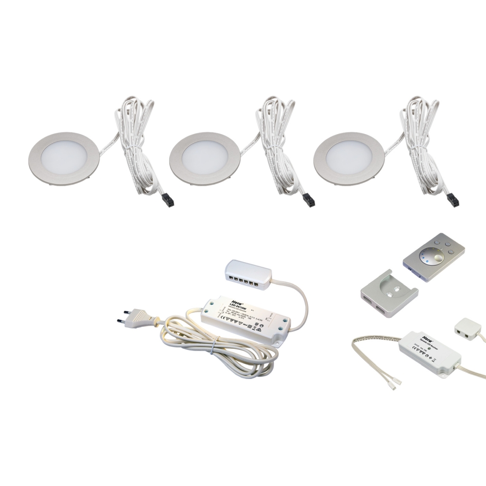 3pc. set of Dynamic FR 55-LED 3W, stainless steel look, 24V DC, surface mount radio remote, transformer 15W