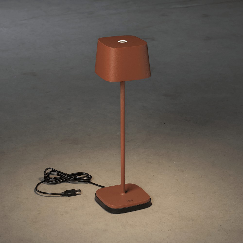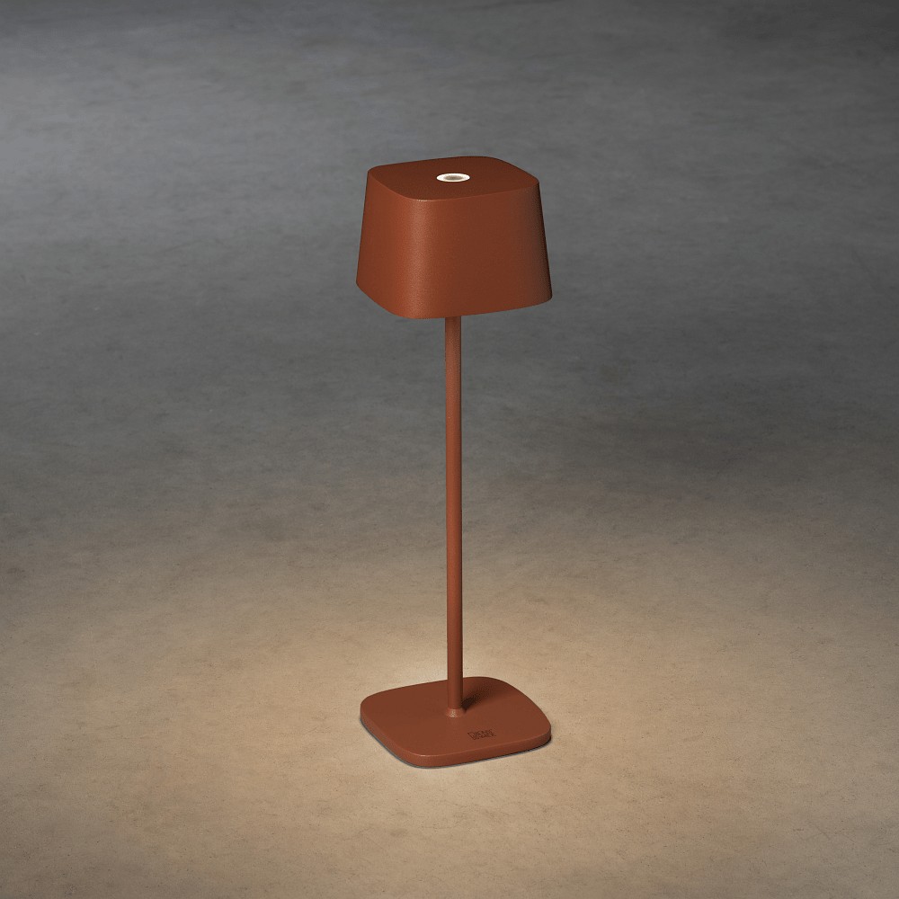 The square shape and terracotta color make the LED Battery Table Lamp CAPRI a real eye-catcher. The housing is made of aluminum, ensuring durability and stability. With dimensions of 10x36x10 cm and a weight of 0.8kg, it is easy to transport and versatile in use.