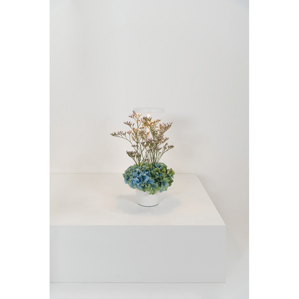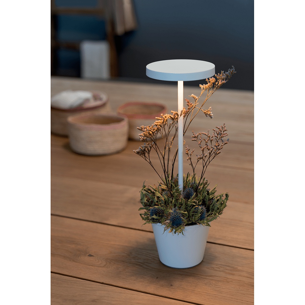 The POLDINA REVERSO features a touch control on the lower part of the lampshade and a USB port. The battery life is up to 12 hours and the charging time is 6-7 hours. Additionally, a multipurpose tray is included, which can be used for plants, stones, or decorations.