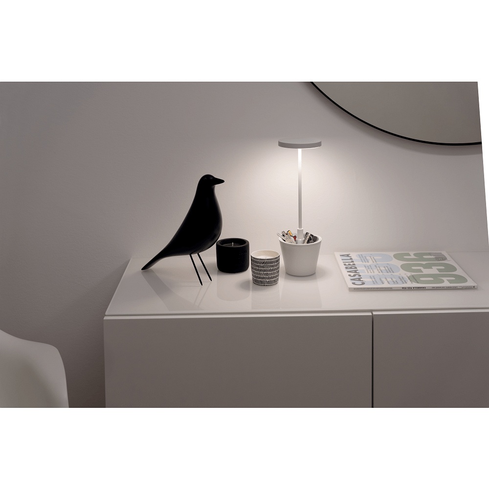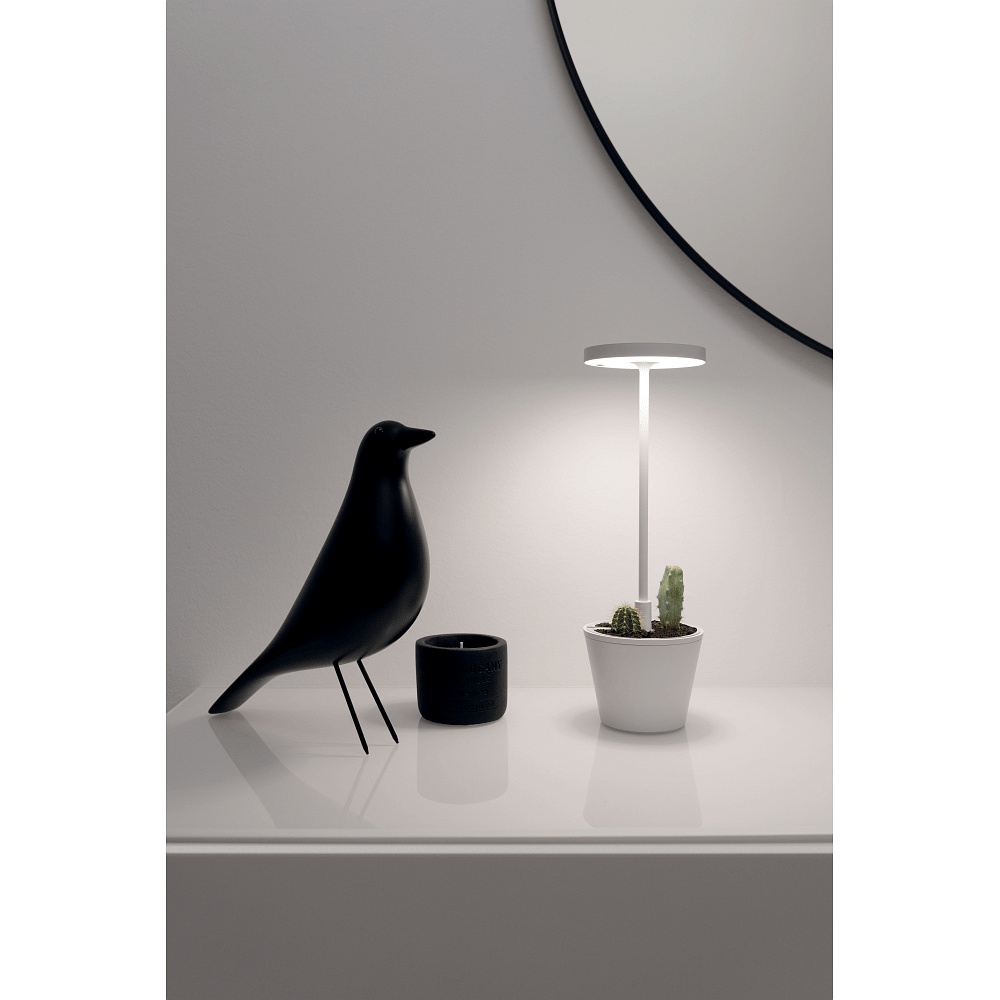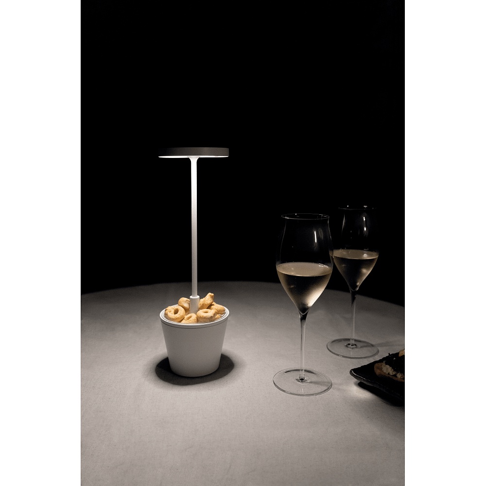The POLDINA REVERSO features a housing made of painted aluminum die-cast and a diffuser made of satin-finished polycarbonate. The design is modern and appealing. The lamp is wireless and portable, making it ideal for indoor and outdoor use.