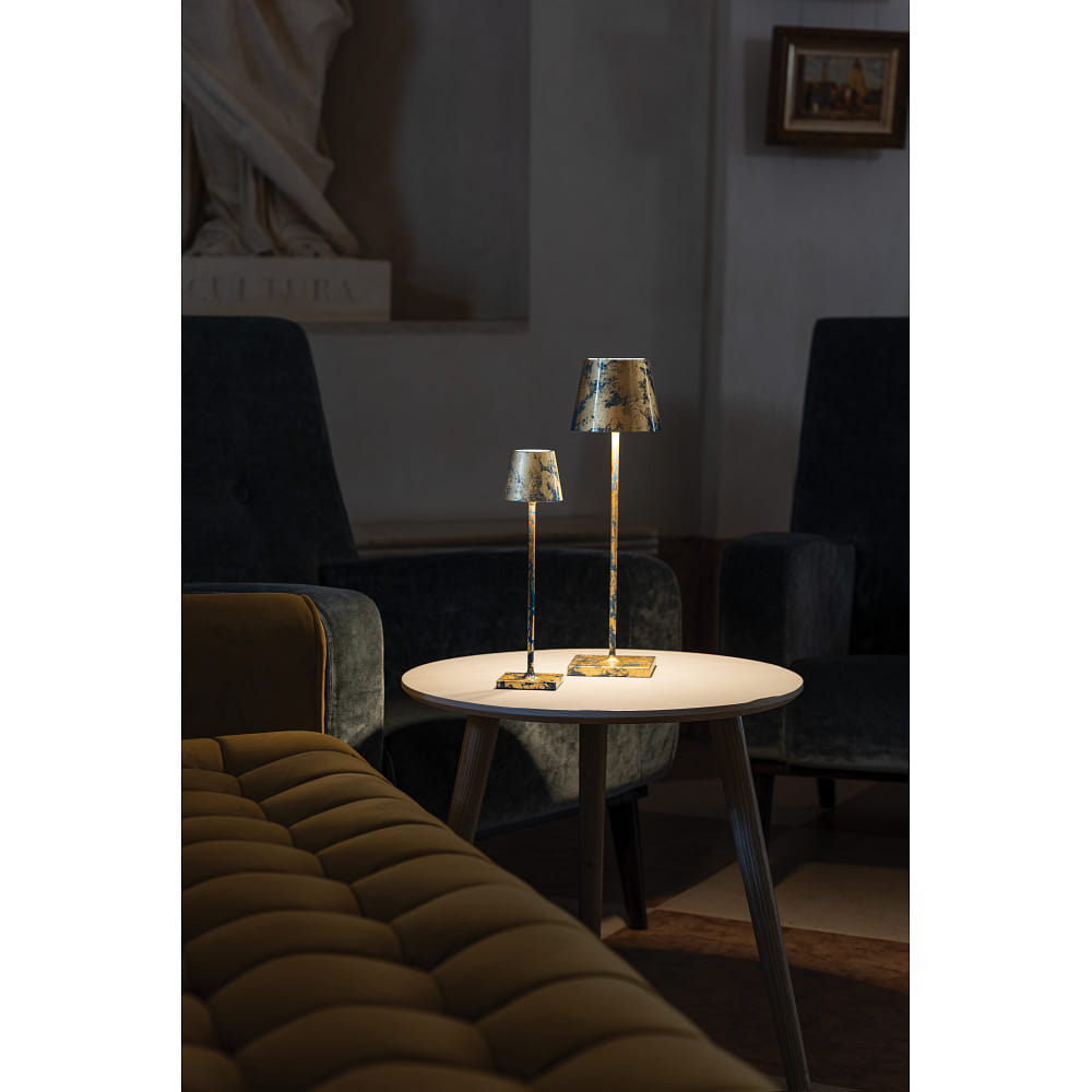 battery table lamp POLDINA TAVOLO PRO IP20, blue, gold leaf dimmable