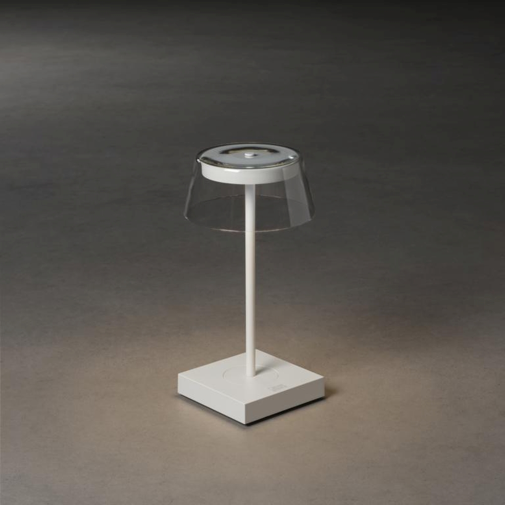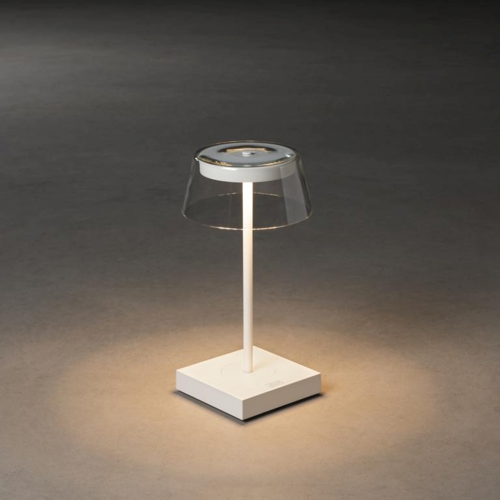 The Outdoor LED Battery Table Lamp SCILLA by Konstsmide is a timeless and decorative light that is suitable for both indoor and outdoor use. With its round, transparent shade on a square base, it is a special highlight in any room.