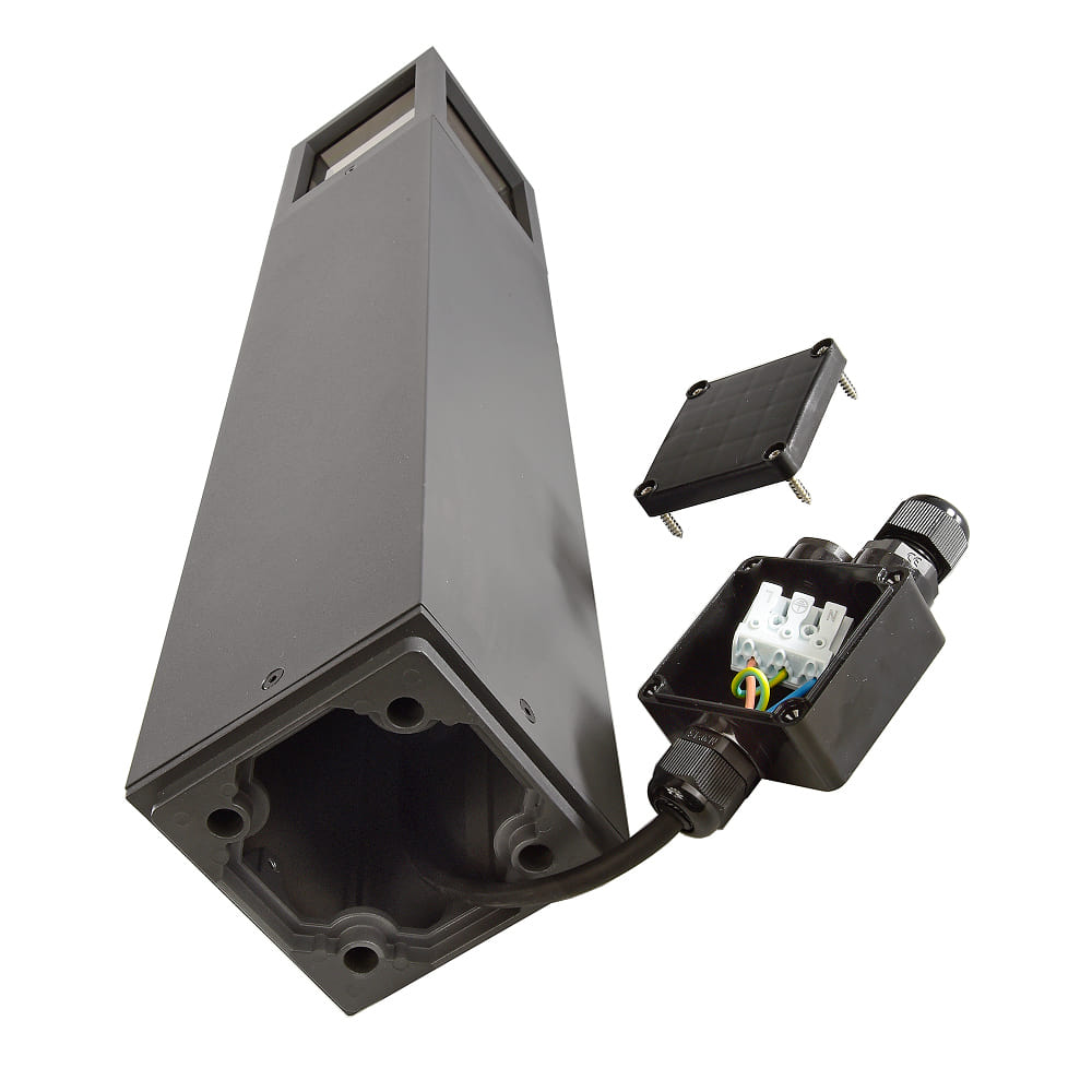 The bollard light is surface-mounted, and thanks to the plug-in connector type, installation is quick and easy. It is possible to wire multiple lights in a row, allowing for flexible lighting design. Additionally, the E27 LED can be easily replaced.
