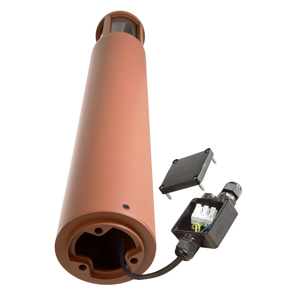 The bollard light is available in different sizes and shapes, optionally in dark gray or rust-colored, with opal cover or clear smoke glass look. The IP67 junction box is suitable for earth cables with 3x1.5mm², 5x1.5mm², or 3x2.5mm². Matching accessories such as junction box, daisy chaining, socket, and mounting accessories are included in the delivery.