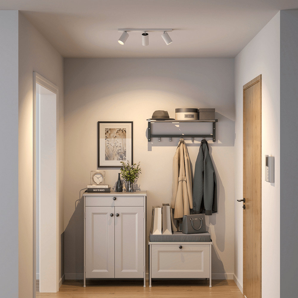 The spotlight is designed for three GU10 bulbs with a maximum power of 7.5 watts, which are not included. The operating voltage is 220-240 volts with a mains frequency of 50/60 Hz. By choosing the appropriate bulbs, brightness, light color, beam angle, and color rendering can be individually adjusted. Additionally, the luminaire is compatible with dimmable bulbs and can therefore be adapted to different lighting needs.