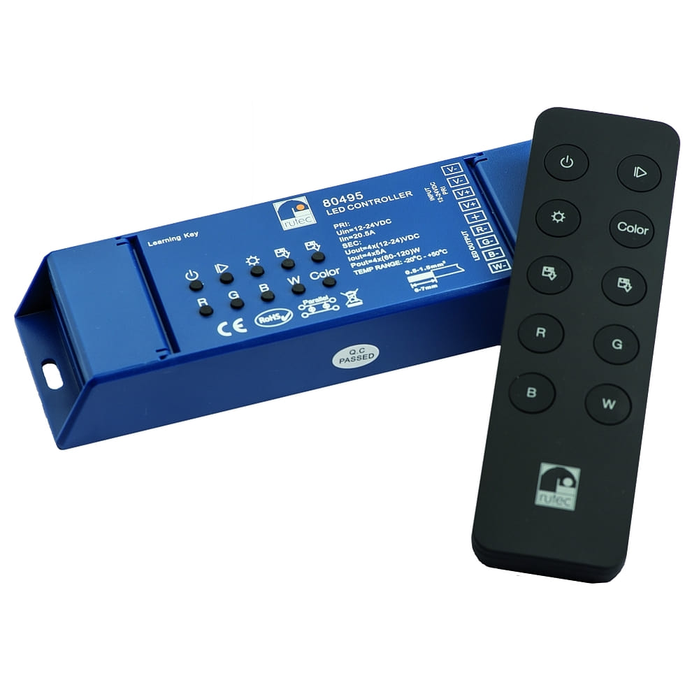 Het artikelnummer van deze controller is RUP-PHZ495. Het wordt geleverd als een set inclusief de radiocontroller (RGBW) en een radiofrequentie afstandsbediening met magnetische wandmontage. De afstandsbediening heeft een bereik tot 30 meter.