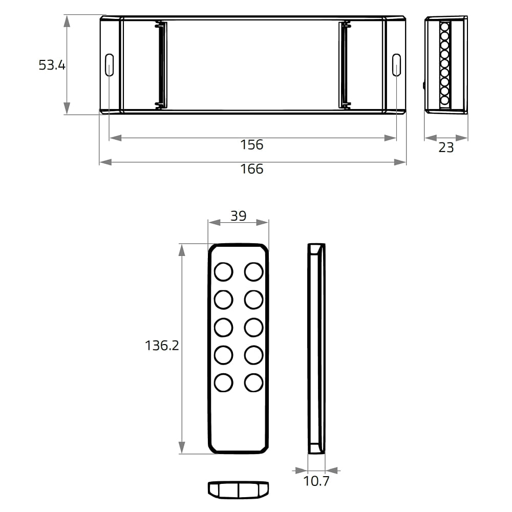 LED-radiocontroller, IP20, 12V/24V, 240W/480W, met afstandsbediening + wandmontage, 30 meter