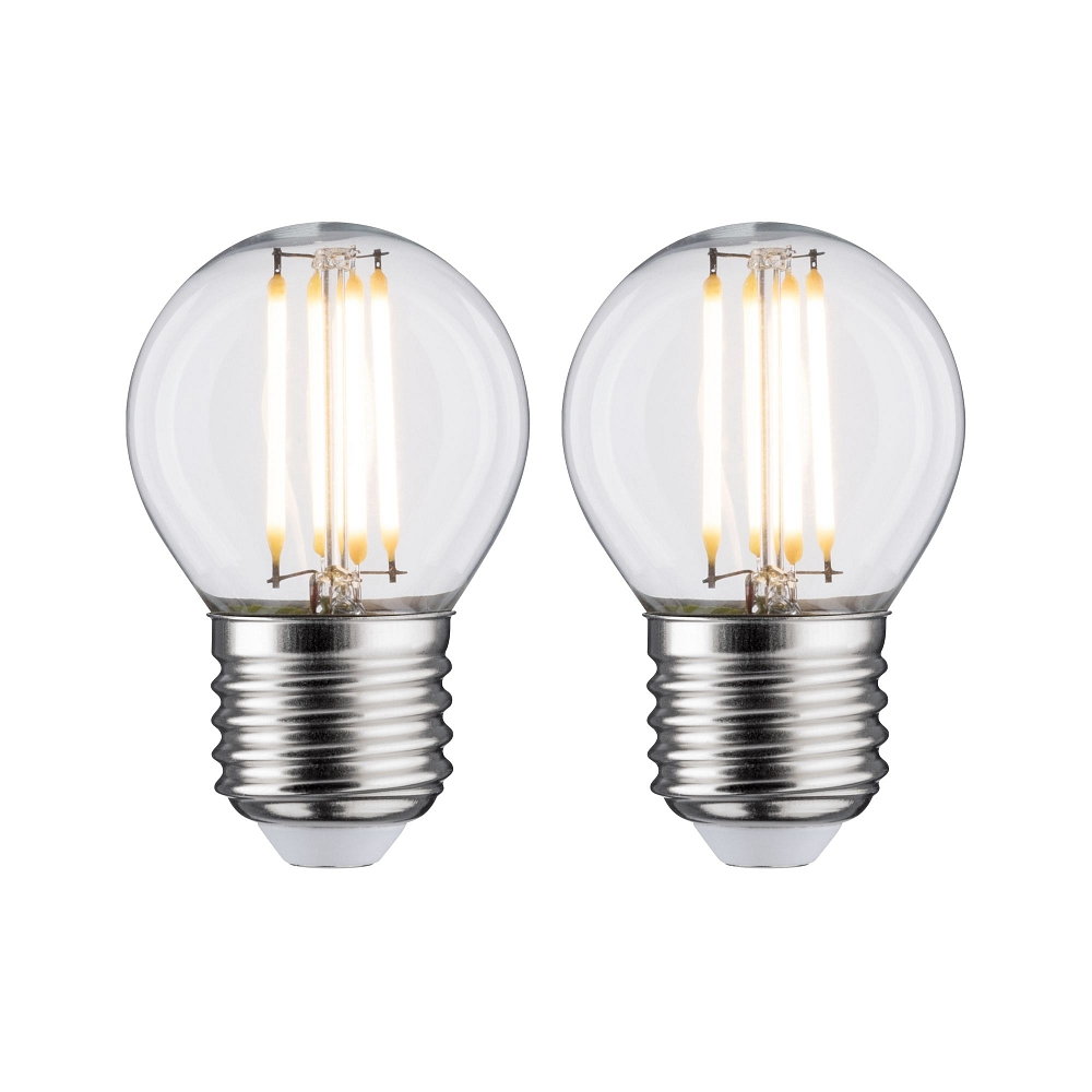 The 2-pack LED Filament Drop Shape P45 from Paulmann is an energy-saving lighting solution with a power consumption of 5W. The clear color and extra warm white light create a cozy atmosphere in any room.