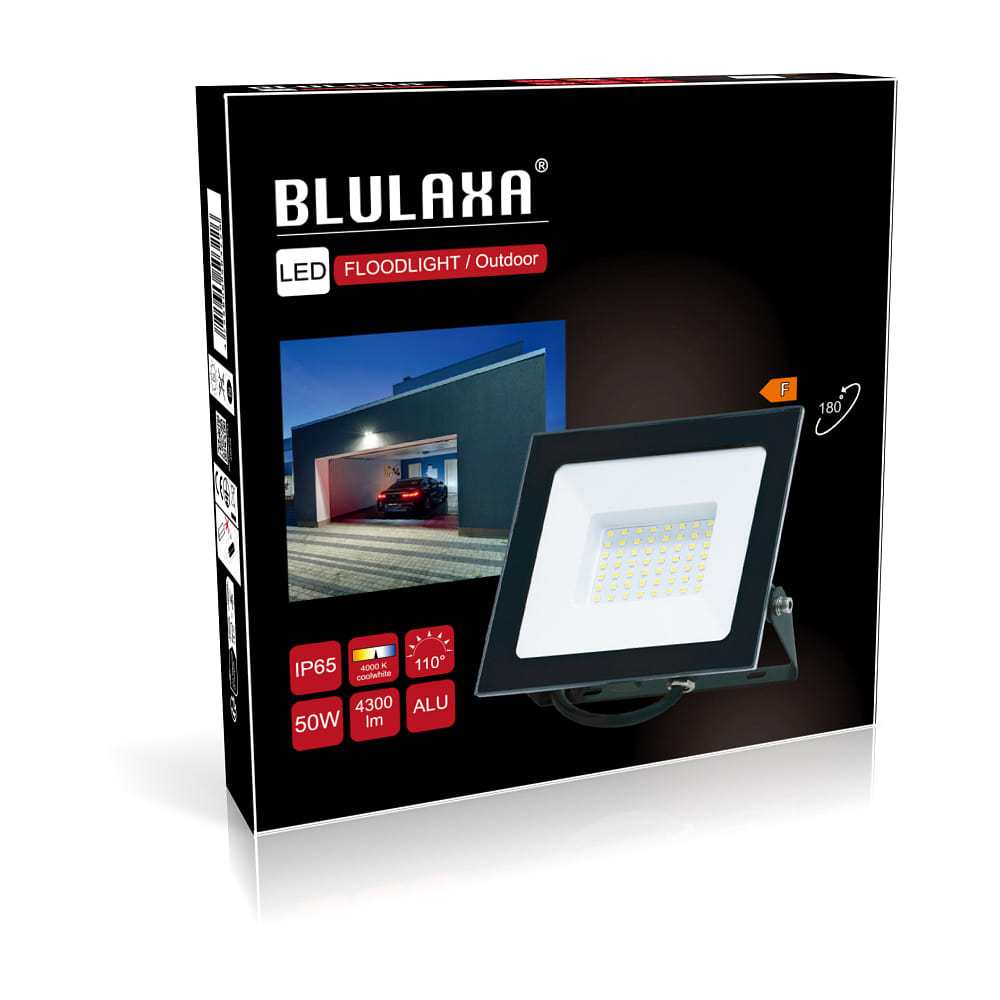 The LED floodlight from Blulaxa offers a strong performance of 50W and a light output of 4300lm. With a beam angle of 110°, it provides wide area illumination. The color temperature is 4000K, creating a pleasant bright light. Thanks to the IP65 protection class, the floodlight is suitable for outdoor use. The swiveling construction allows for individual light orientation.