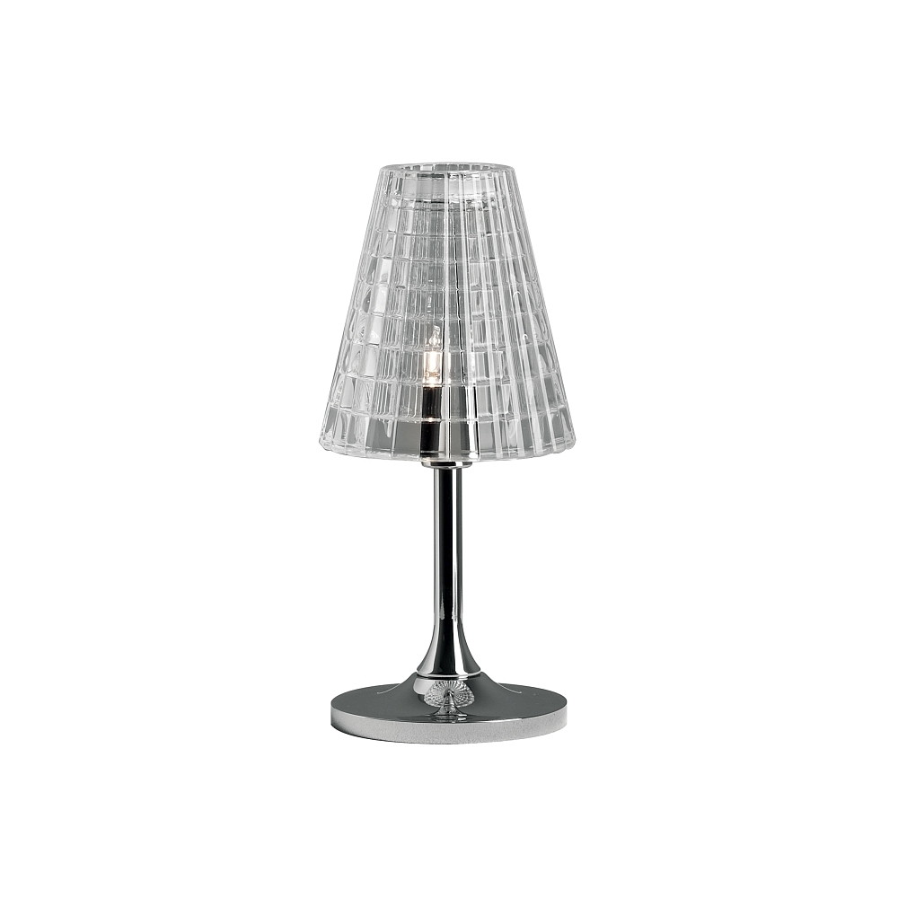The table lamp FLOW is made of chrome-colored metal and clear crystal glass, which provides an elegant appearance and high durability. The polished surface gives the lamp a modern and stylish look.