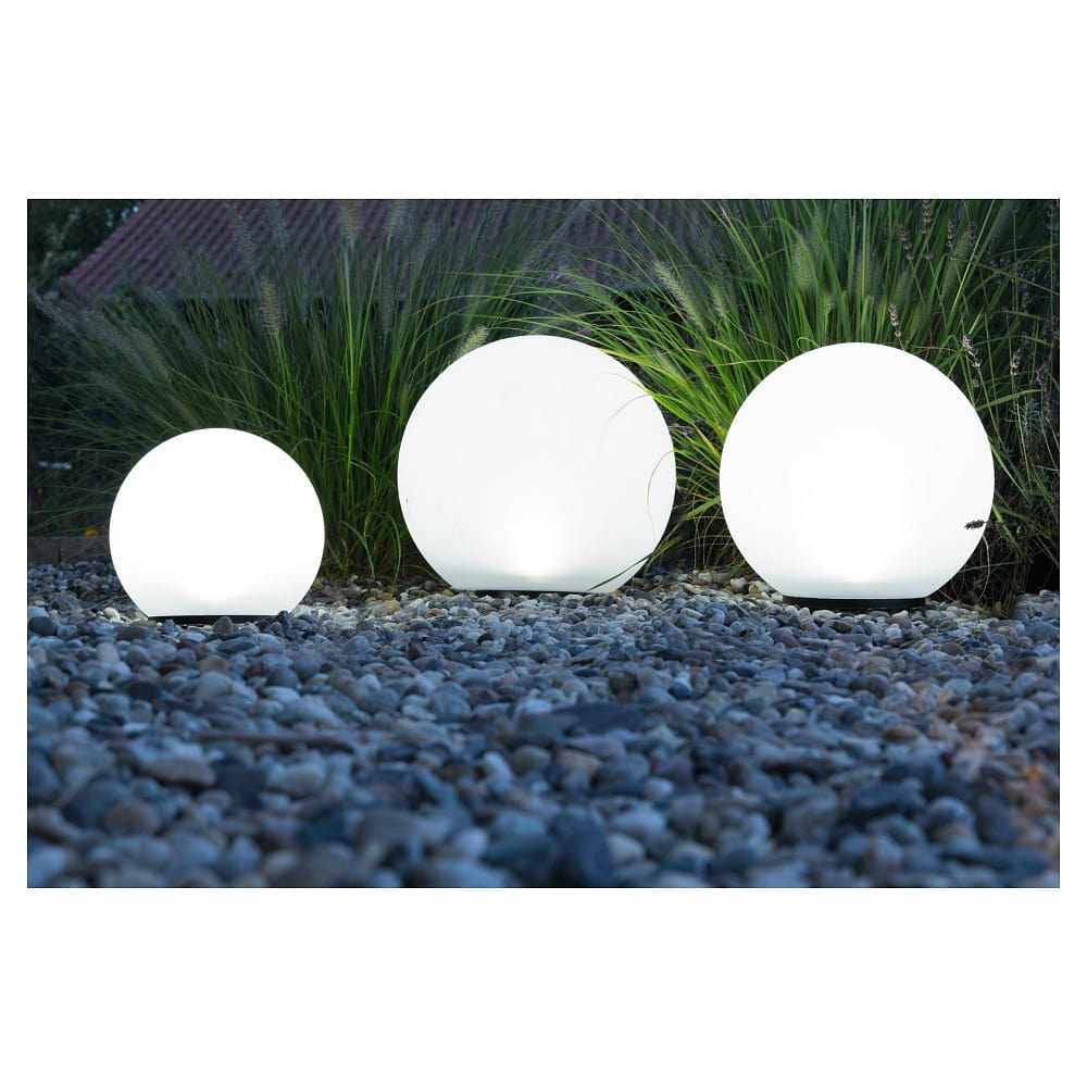 The Solar Sphere Light does not require a power connection as it has an integrated solar panel. This makes it environmentally friendly and energy efficient in operation. The light is also available in other sizes and can be purchased as a set of 3 with different diameters. With the Solar LED Sphere Light BOULE, you can set stylish accents outdoors and create a cozy atmosphere when it gets dark.