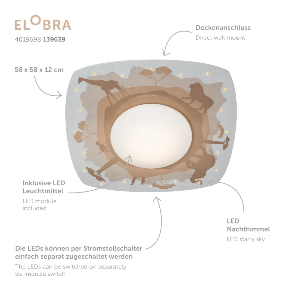 The required light source is included in the scope of delivery of the ceiling light. The brand Elobra stands for high-quality and durable lighting solutions. The item number ELO-139639 and the EAN 4019698139639 guarantee the quality and originality of the product.