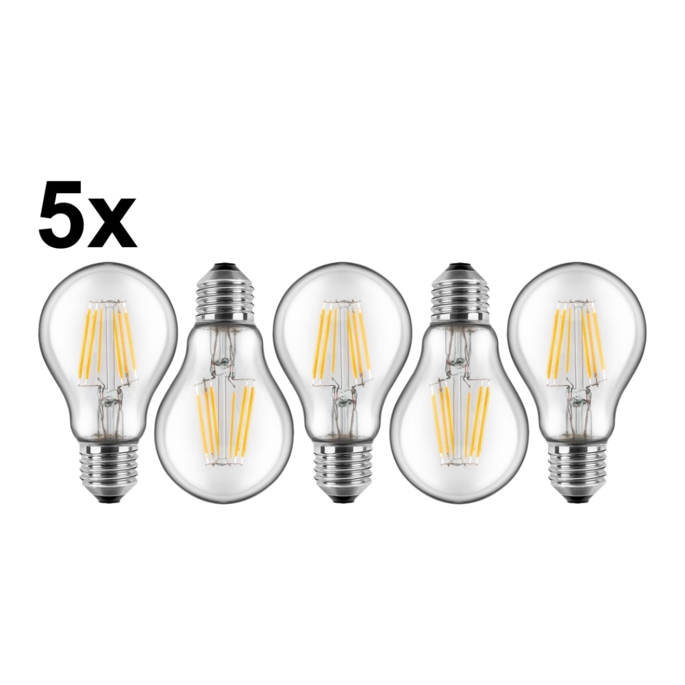 Set van 5 LED filamentlampen A60, E27, 7W 2700K 810lm 300°, transparant