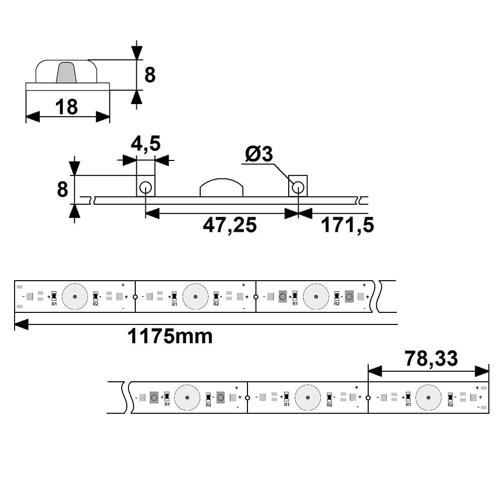 The retrofit board has a color rendering index of 80-89Ra and an average lamp lifespan of 50000 hours. It has dimensions of L/W/H: 117.5/1.8/0.8 cm and is made of plastic. It operates with a voltage of 24V and an electronic transformer as the operating device. The power factor is 0.95 and the conductor cross-section is 0.75mm2.
