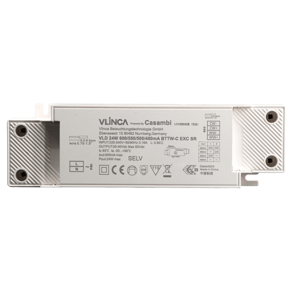 The CASAMBI LED power supply NU2BT98-24 offers various selectable output current strengths: 450mA, 500mA, 550mA, and 600mA. Depending on the requirements, LEDs can be connected in series to achieve the desired lighting. With a radio signal of 2.4-2.483 GHz and an integrated antenna, reliable control is ensured.