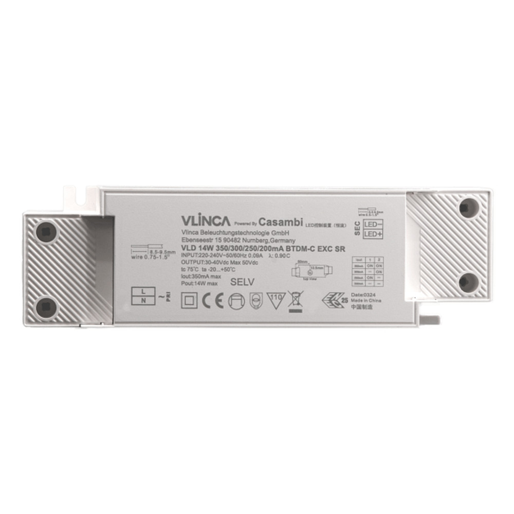 The multifunctional CASAMBI LED Power Supply Unit NUBT98-14 is an independent LED power supply unit with constant current that can be operated with smart devices. It has an operating voltage of 220-240V and a variable output current of 200-350mA, equivalent to a power of 14W.
