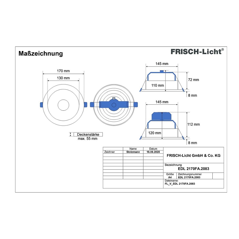 The LED recessed downlight from Frisch-Licht impresses with its round shape and high-quality workmanship made of aluminum, plastic, polymethyl methacrylate (PMMA), and steel sheet. With a power output of 20 watts and a luminous efficacy of 100 lumens per watt, it produces a bright luminous flux of 2000 lumens in a pleasantly warm white color temperature (3000K). The integrated LED is permanently installed and not replaceable, but offers a long lifespan of up to 50,000 hours, significantly reducing maintenance effort.