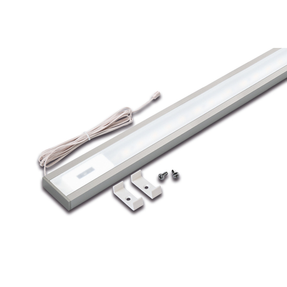 The LED under cabinet light has a size of 120 x 4 x 1.2 cm and is made of aluminum and plastic. The diffuse light is generated by a high-quality diffuser lens that ensures a pleasant light distribution. The fixture can be easily mounted with the LED-24 plug system.