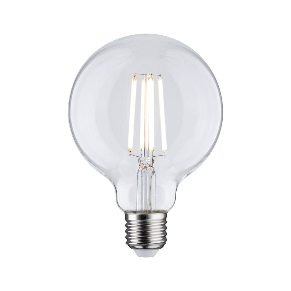 De ECO-LINE G95 LED filament lamp van Paulmann valt op door zijn hoge energie-efficiëntie en lange levensduur. Met een elektriciteitsverbruik van slechts 4 watt vervangt hij een conventionele gloeilamp van 62 watt, waardoor tot 94% energie wordt bespaard. De lamp heeft een transparante glazen behuizing en bereikt een indrukwekkende lichtopbrengst van 210 lumen per watt, wat zorgt voor helder en aangenaam licht.