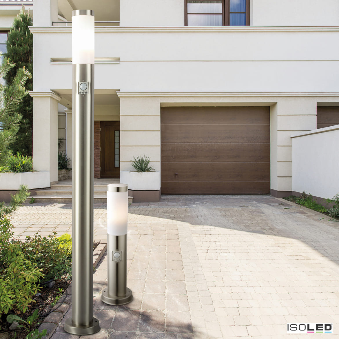 Lichtpaal 1100 cilindrisch, met sensor, schakelbaar E27 IP44, rvs