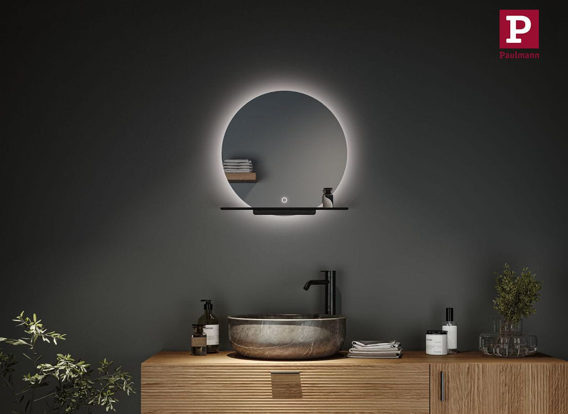 The LED lighted mirror MIRO impresses with its minimalist, round shape and the high-quality, matte black housing made of acrylic and metal. With a diameter of 50 cm and a depth of only 10.5 cm, this mirror stylishly fits into any wall design. The frameless look ensures a contemporary aesthetic, which is further emphasized by the indirect light emission towards the wall and the soft side lighting. Thanks to the removable shelf with front-side fall protection, the mirror also provides practical storage space for small items.