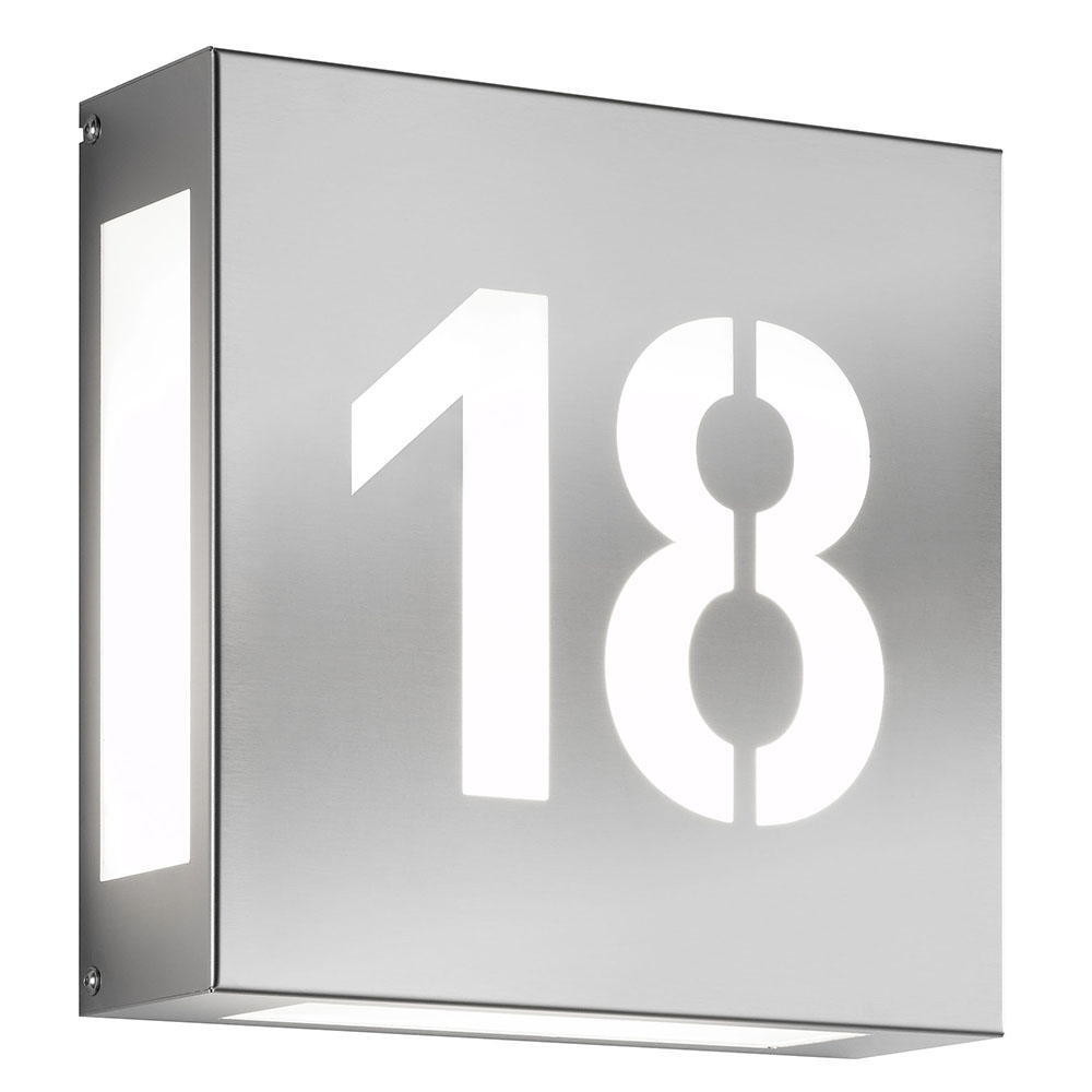 The LED house number light AQUA LEGENDO impresses with its elegant stainless steel design, which is not only durable but also particularly stylish. With dimensions of 28 x 28 x 9.5 cm, the light blends harmoniously into any facade and ensures clear visibility of the house number. The high-quality workmanship guarantees a long service life and makes the light a reliable companion.