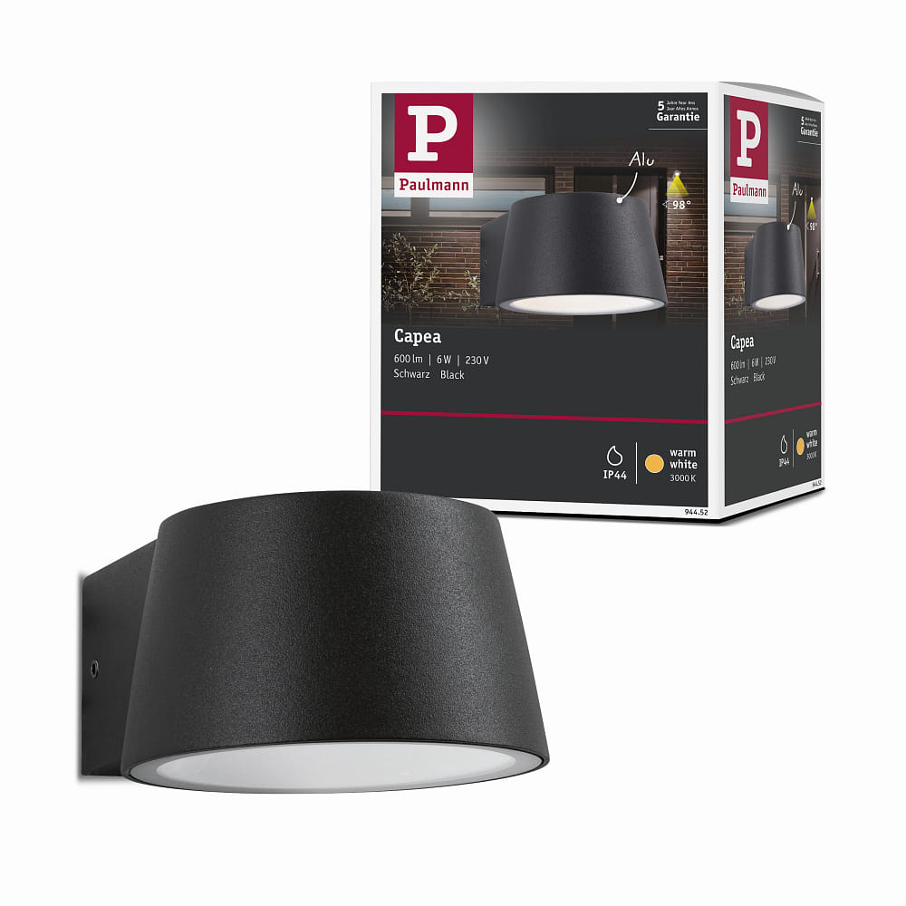 The LED outdoor wall light CAPEA is from the renowned brand Paulmann and has the item number PAUL-94452. With a weight of 386kg and a size of 9.6 x 5.6 x 12.8 cm, it offers a compact solution for outdoor lighting.