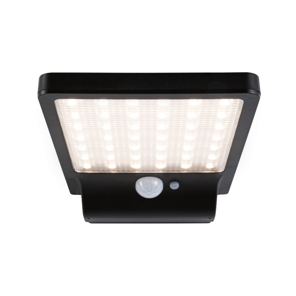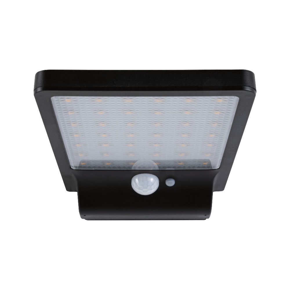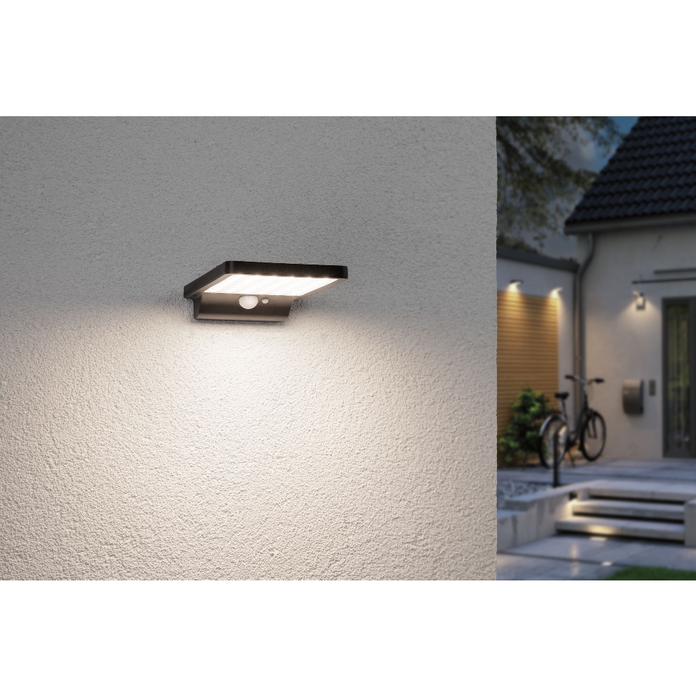 The LED Solar Wall Light SOLVEIGH by Paulmann is a square outdoor wall light in black with a power of 4.8W and a light output of 280lm. Thanks to the integrated solar panel and battery, no mains connection is required, making installation particularly easy.