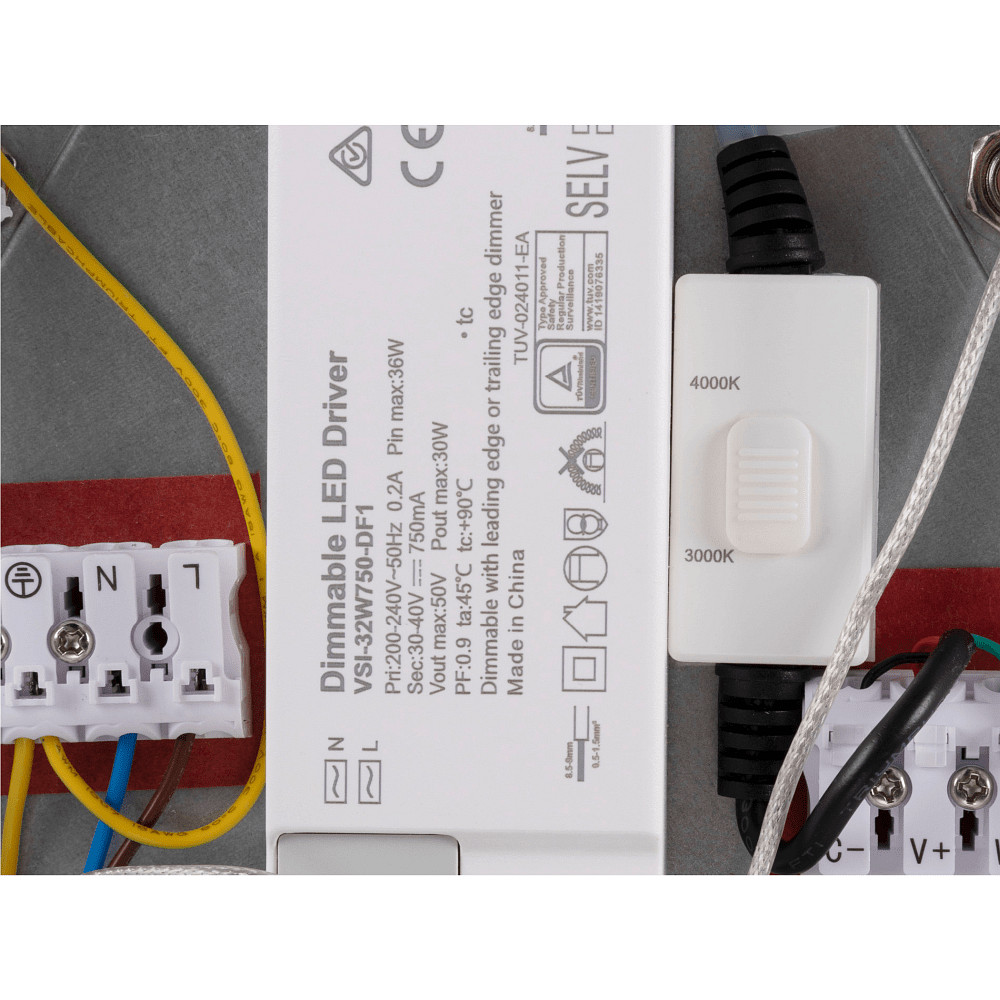 The PANEL 60 offers two selectable color temperatures of 3000 Kelvin (warm white) and 4000 Kelvin (neutral white), which can be adjusted stepwise. This allows for individual customization of the lighting atmosphere. Additionally, the luminous flux is continuously dimmable, enabling flexible brightness control. The phase-cut dimming ensures easy integration into existing lighting systems.