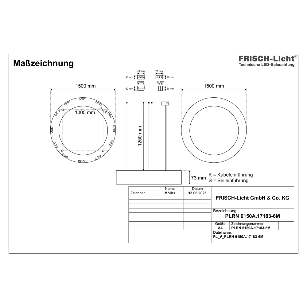 De LED-hangring FL-PLRN6150A.17183-6M van FRISCH-Licht® overtuigt met zijn efficiënte en professionele verlichtings-technologie. Met een diameter van 150 cm biedt hij een brede oppervlakteverlichting en is hij bijzonder geschikt voor werkplekken. Het apparaat beschikt over een functie met meerdere effecten waarmee de lichtintensiteit direct op het apparaat op verschillende niveaus kan worden aangepast. Dit maakt een flexibele aanpassing van de lichtsterkte aan individuele behoeften mogelijk – van 78 tot 137 watt.