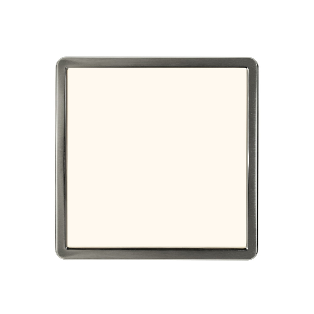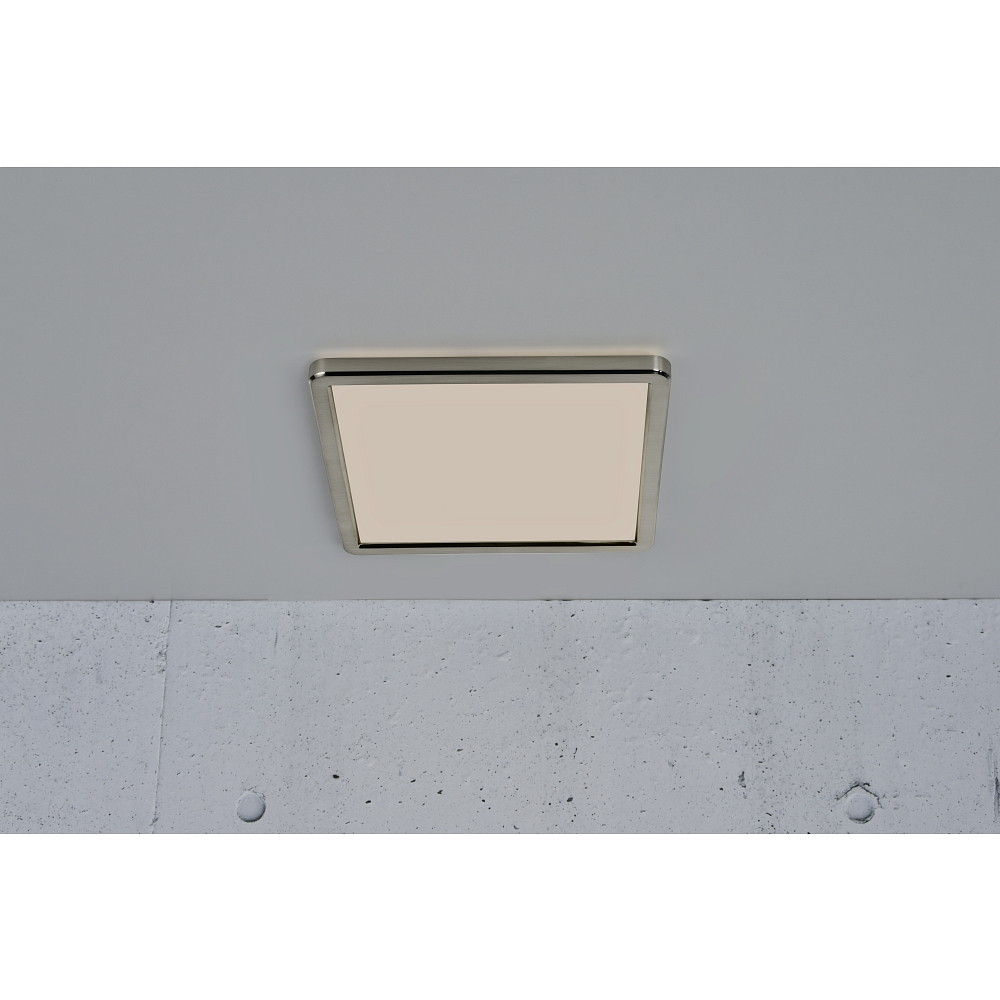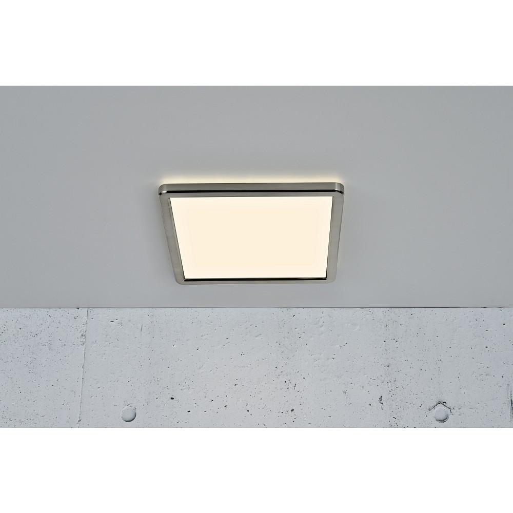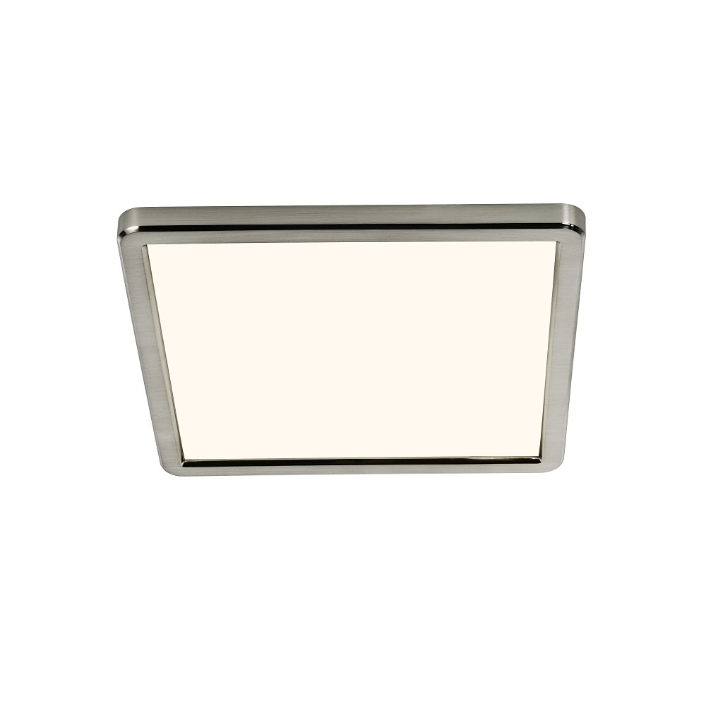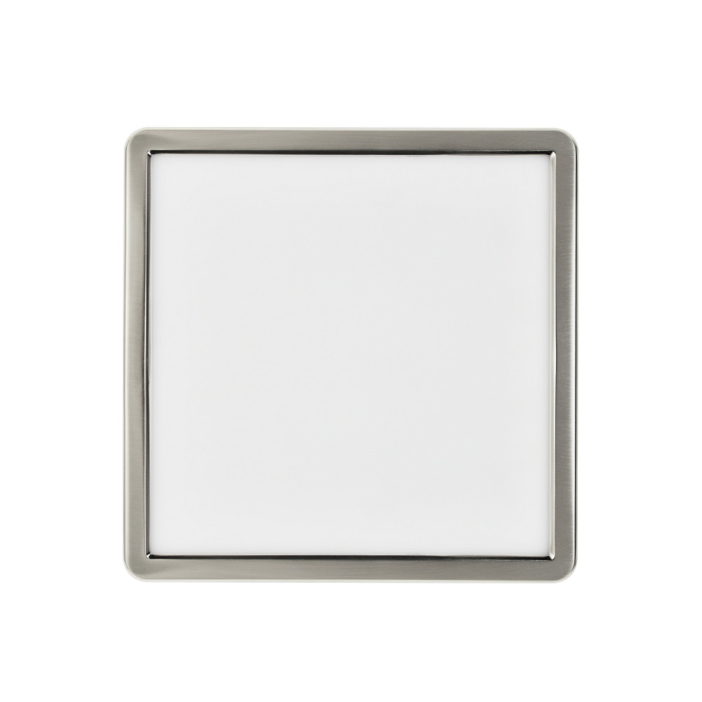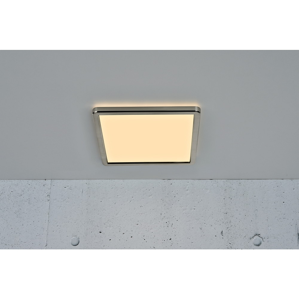 De LED plafondlamp voor badkamer wordt geleverd met een permanent geïnstalleerde LED-module. De lamp heeft een rechthoekige vorm en is verkrijgbaar in geborsteld nikkel en wit. Met een gewicht van 0,75 kg en afmetingen van 30x30x2,5 cm (totaal) of 29,4x29,4x2,3 cm (zonder decoratieve rand), integreert de lamp harmonieus in elk kamerontwerp.