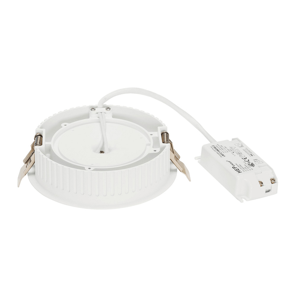 De inbouw plafondlamp heeft een totale diameter van 14 cm en een inbouwdiepte van 3,7 cm. Het zichtbare gedeelte heeft een diameter van 14 cm en een hoogte van 0,1 cm. Het licht heeft een stralingshoek van 120° en een beschermingsklasse van IP20. Het wordt geleverd met een driver en klemmen en kan worden gedimd met een fase-dimmer.
