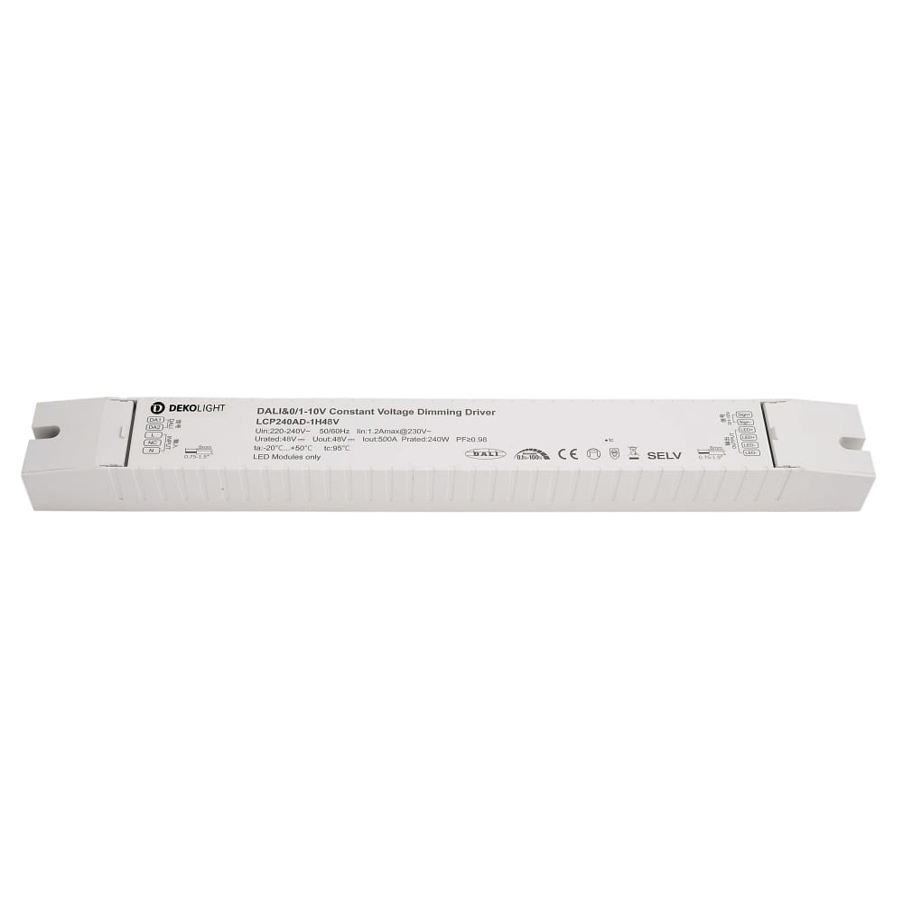 The power supply (CV, DC) BASIC from Deko-Light with model number LCP240AD-1H48V offers a power consumption of 240W and a high power factor of 0.98. With an average lamp lifespan of 50000 hours, this power supply is robust and durable. It is ideal for use in various lighting applications.