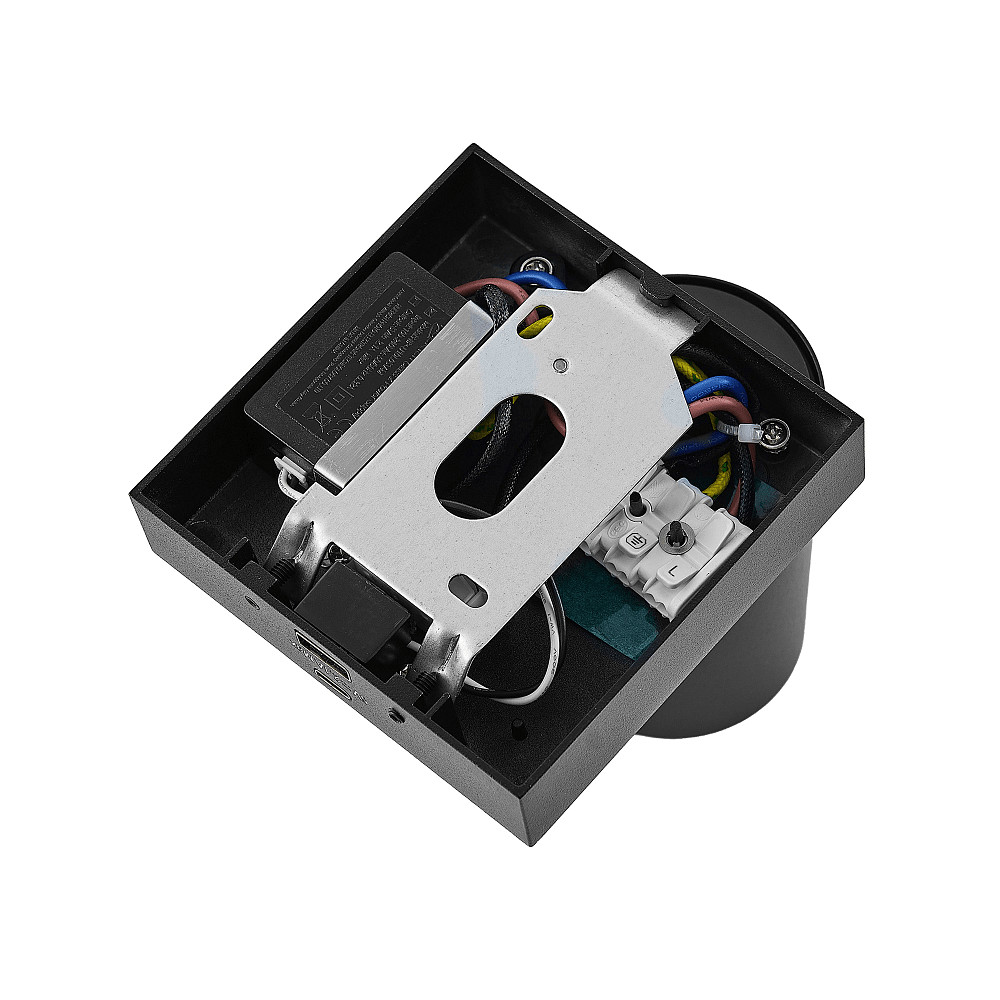 The CAN TILT SQUARE USB is designed for surface mounting on the wall and features a mains connection via a terminal block. The lamp is ENEC-certified and corresponds to protection class 1 as well as protection rating IP20. With a weight of only 0.386 kg, installation is straightforward. Thanks to the robust materials and well-thought-out technology, the lamp offers a durable and reliable lighting solution with additional practical functions.