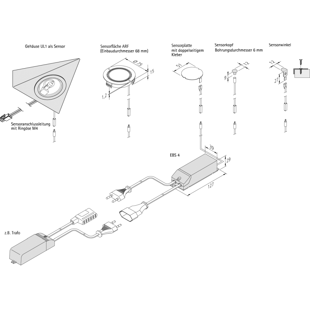 Ring eyelet M4 for Under-cabinet luminaire UL 2-LED F, for connection to EBS 4 sensors, with 200cm sensor line, white