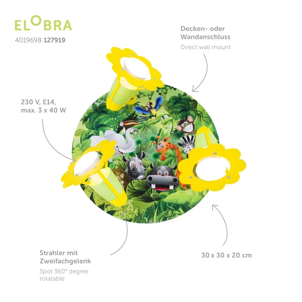 The ceiling light Rondell WILDERNESS ANIMAL WORLD in Green is a real eye-catcher for any room. With three E14 sockets, it offers the possibility to create pleasant lighting and set accents at the same time.