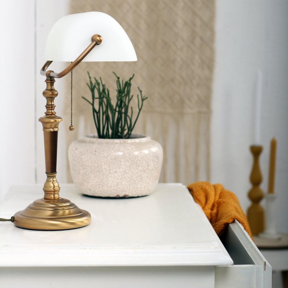 The banker lamp ANCILLA combines nostalgic design with modern functionality. Whether as atmospheric lighting in the living room or as a practical reading lamp in the bedroom - the versatile applications make the ANCILLA a real highlight in any room. Bring a piece of timeless elegance into your home with this table lamp.