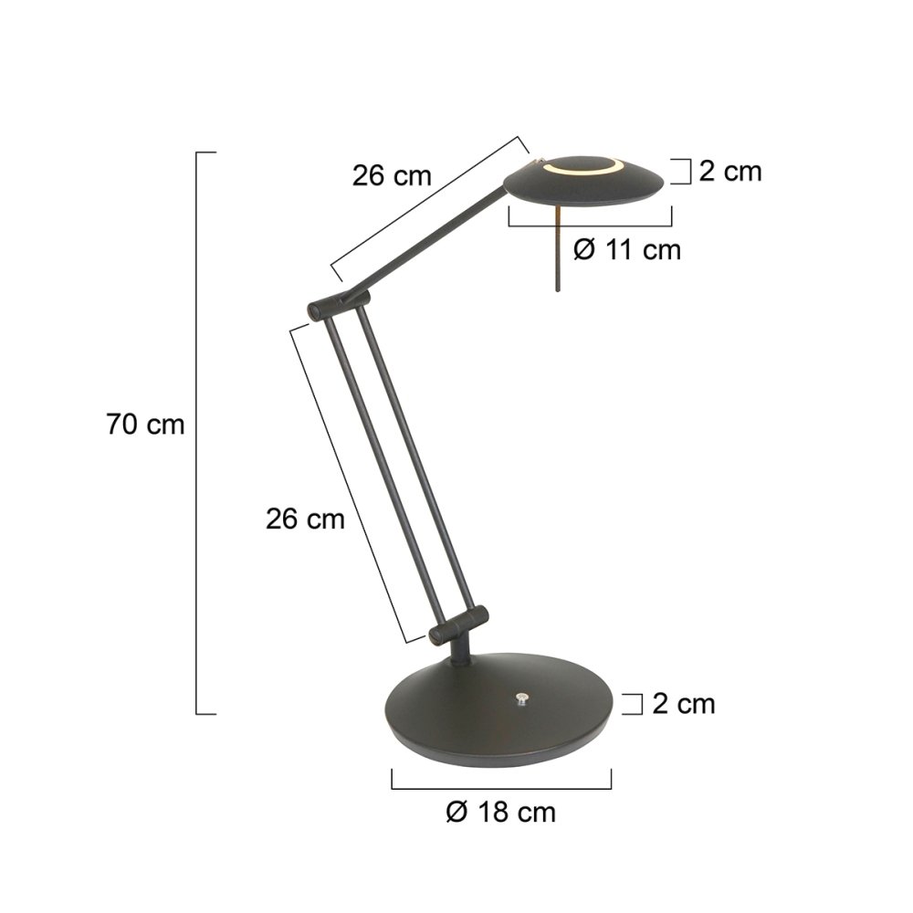 The table lamp has a minimum size of Ø18cm and 30cm height, with a maximum size of Ø18cm and 60cm height. The head of the lamp has a diameter of 11cm and a height of 2cm. With a reach of 52cm and a lamp base of Ø18cm and 2cm, the lamp is flexible for use.