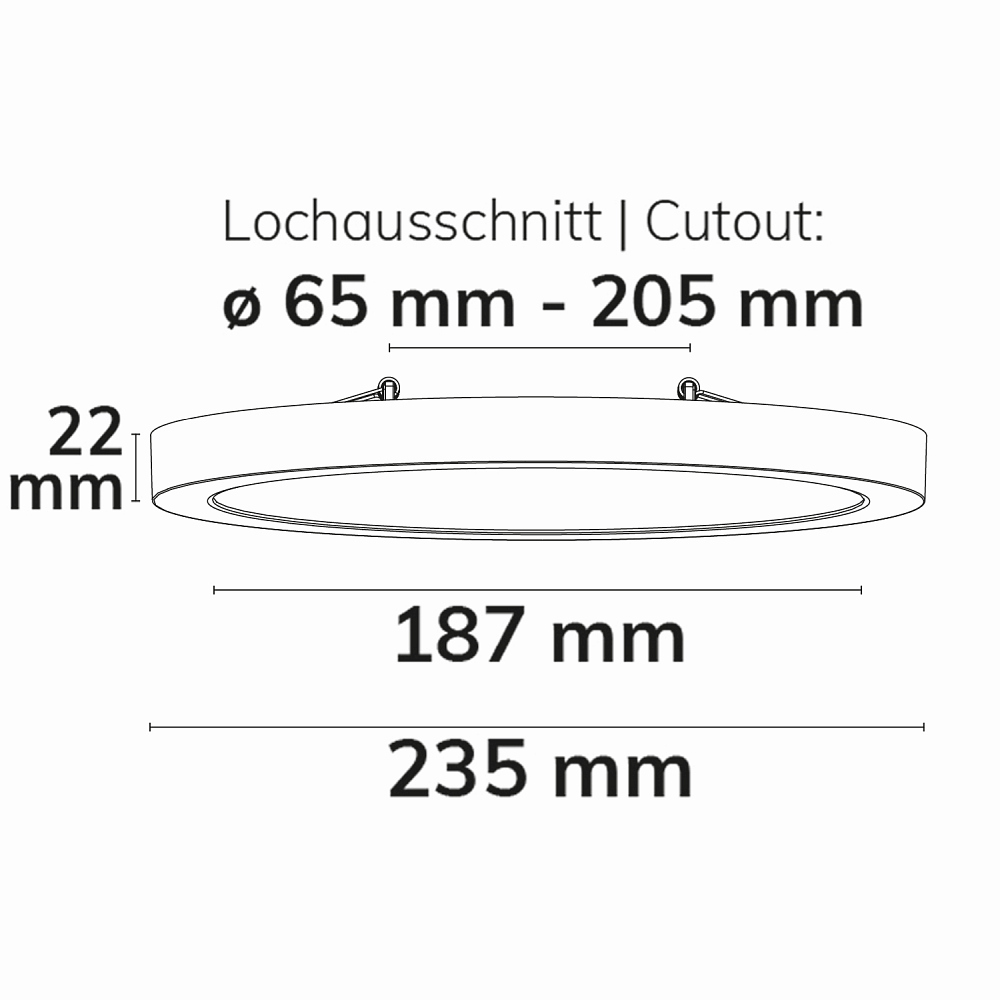 The LED surface-mounted/recessed light FLEX PRO DN235 from ISOLED impresses with its adaptability and high-quality workmanship. With a diameter of 23.5 cm and a slim installation depth of only 2.3 cm, this light is ideally suited for various mounting options. It can be used both as a surface-mounted and recessed fixture and fits into installation openings from 6.5 cm to 20.5 cm in diameter thanks to its lockable mounting rail with adjustable clip springs. This allows existing drill holes to be used easily, making installation particularly time-saving.