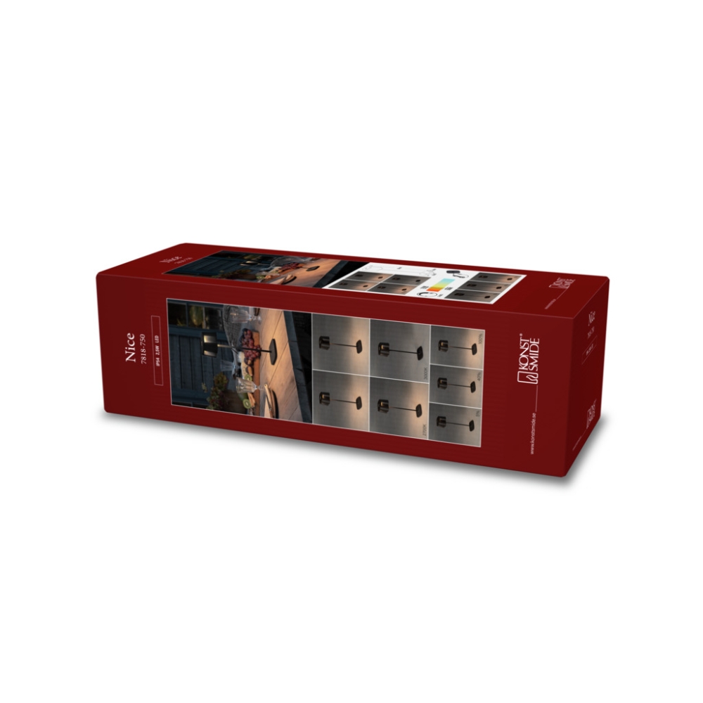 De lamp heeft een vermogen van 2,5W en een lichtstroom van 10-120lm. De kleurtemperatuur is 2700K/3000K en de kleurweergave-index is hoger dan 80Ra. Met een gemiddelde levensduur van 20000 uur en 15000 schakelcycli, is de draagbare batterijtafellamp NICE van Konstsmide een duurzame en energiezuinige verlichtingsoplossing.