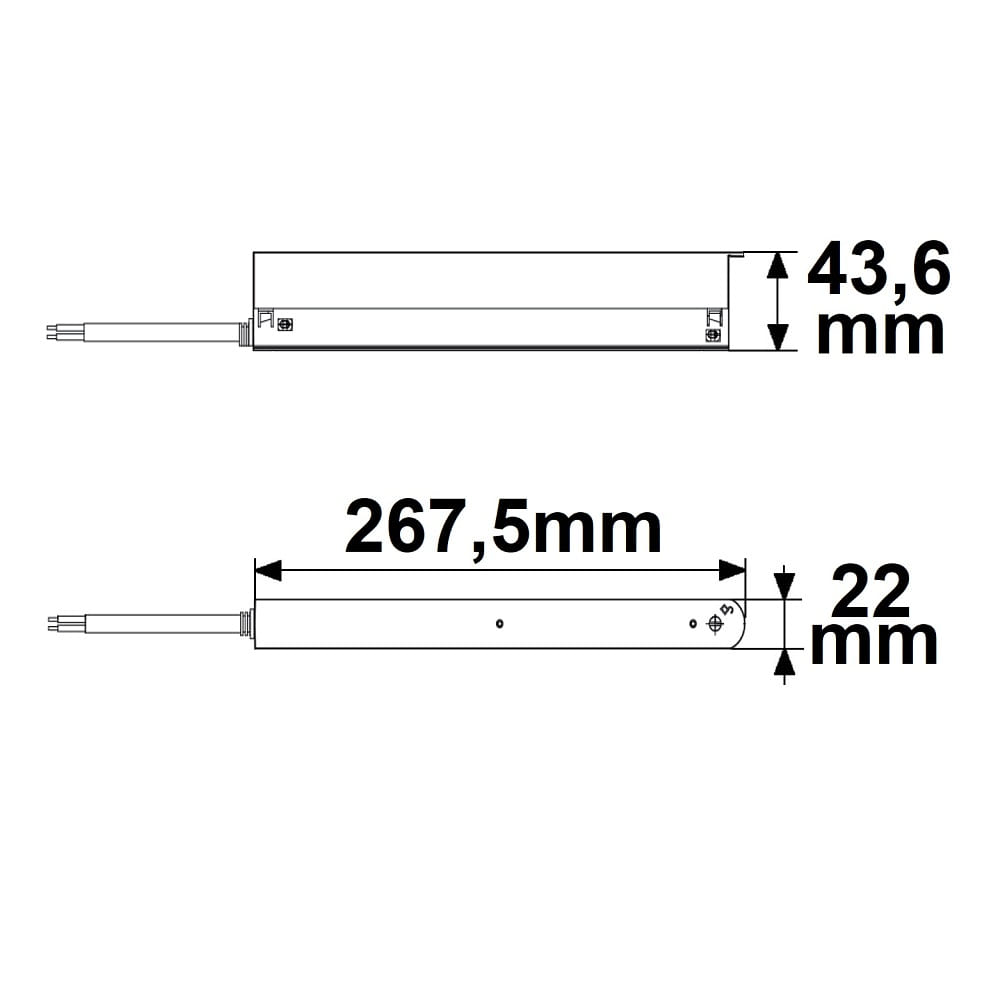 The transformer is mounted bound in the track system and has a mains connection via screw terminal. Thanks to its compact size of 26.75 x 2.2 x 4.36 cm, the transformer is suitable for both ceiling and wall mounting.