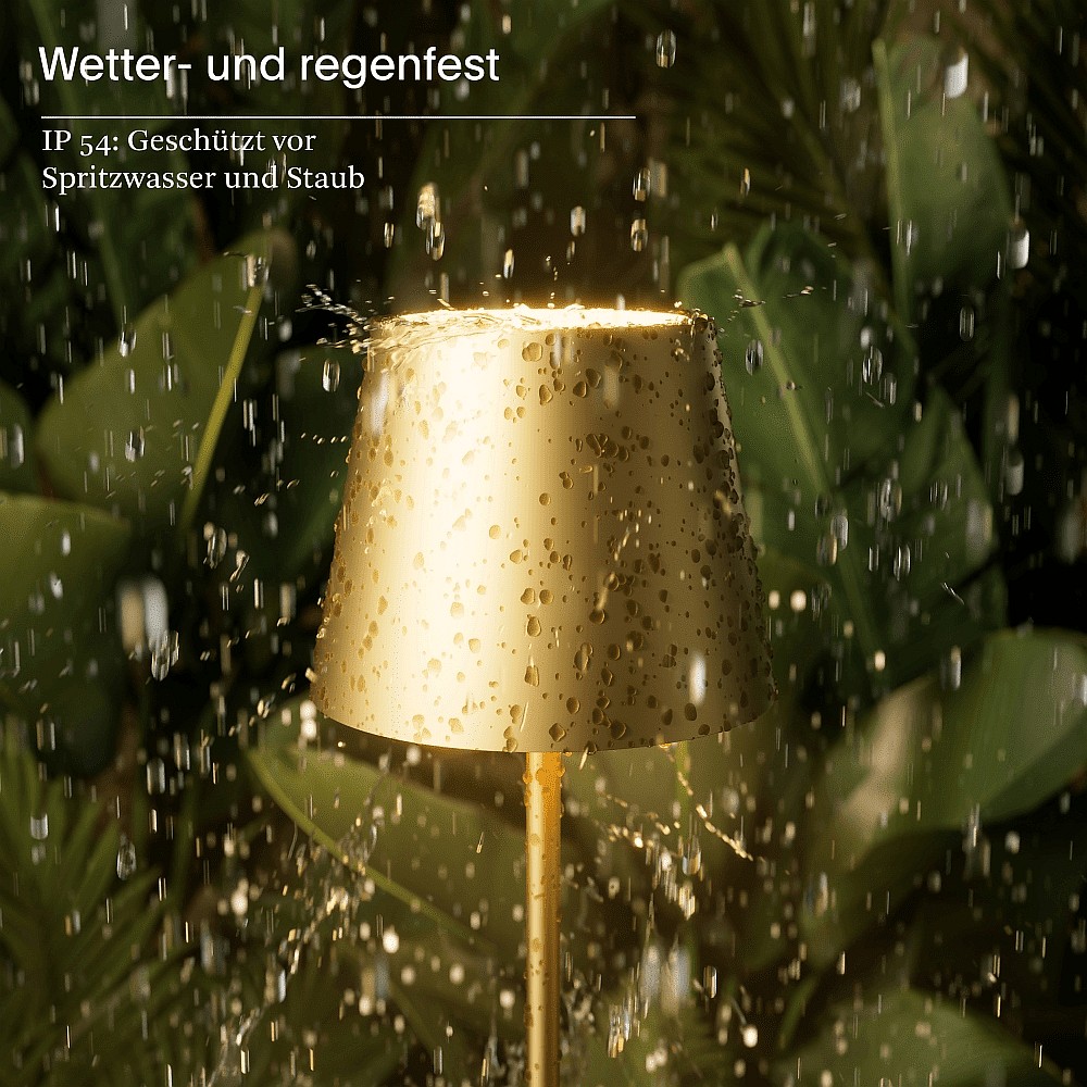 Met een IP54-beschermingsgraad is de batterijgevoede vloerlamp beschermd tegen waterspatten en geschikt voor buitengebruik. Het aluminium frame maakt de lamp bijzonder sterk en duurzaam, terwijl het ronde lampenscherm zorgt voor een gelijkmatige lichtverdeling.
