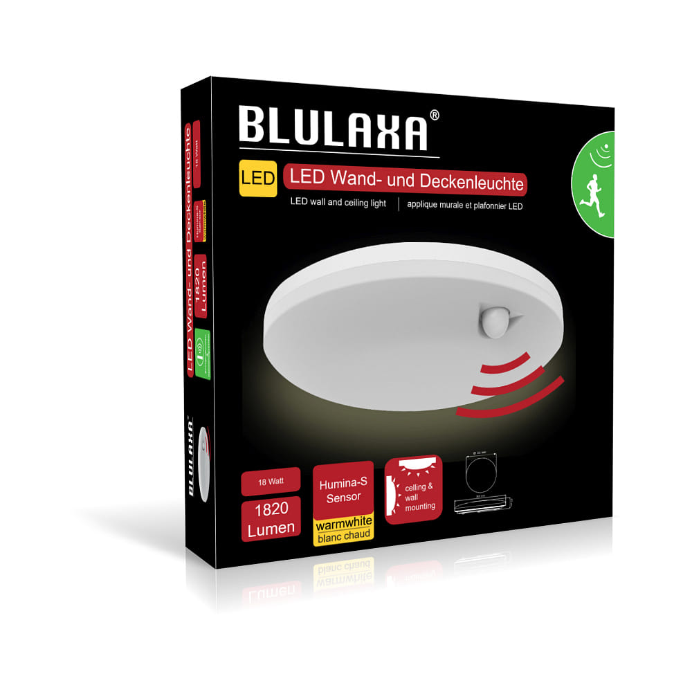 The LED Wall/Ceiling Light HUMINA S by Blulaxa impresses with its round shape and flat, slightly curved diffuser. The impact-resistant white housing provides a modern look, while the IP54 protection class repels splashing water and dust. Ideal for use as a wall light, ceiling light, outdoor light, bathroom light, or surface-mounted light.