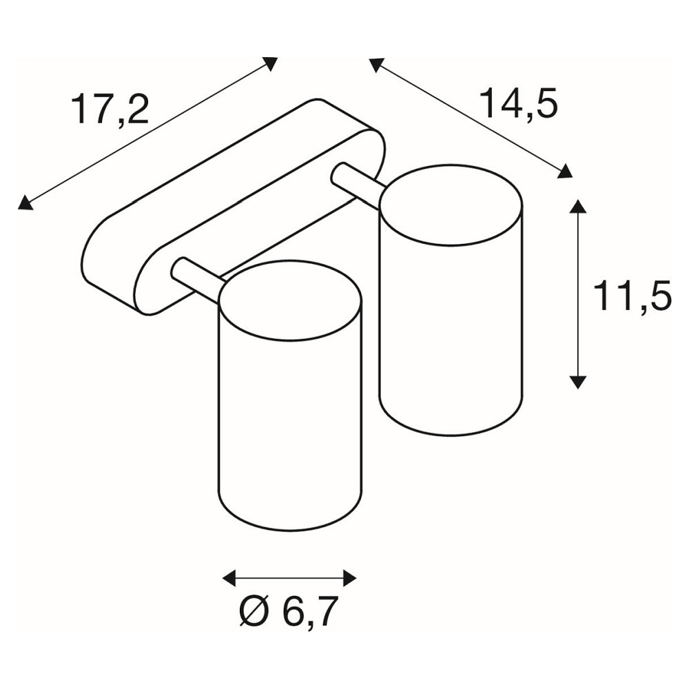 The ENOLA B DOUBLE SPOT has a compact size of 6.70cm in diameter and 12.00cm in length. The rosettes measure 17.00cm in length, 2.00cm in width, and 3.50cm in height. Its geometric shape and timeless design make it a real eye-catcher.