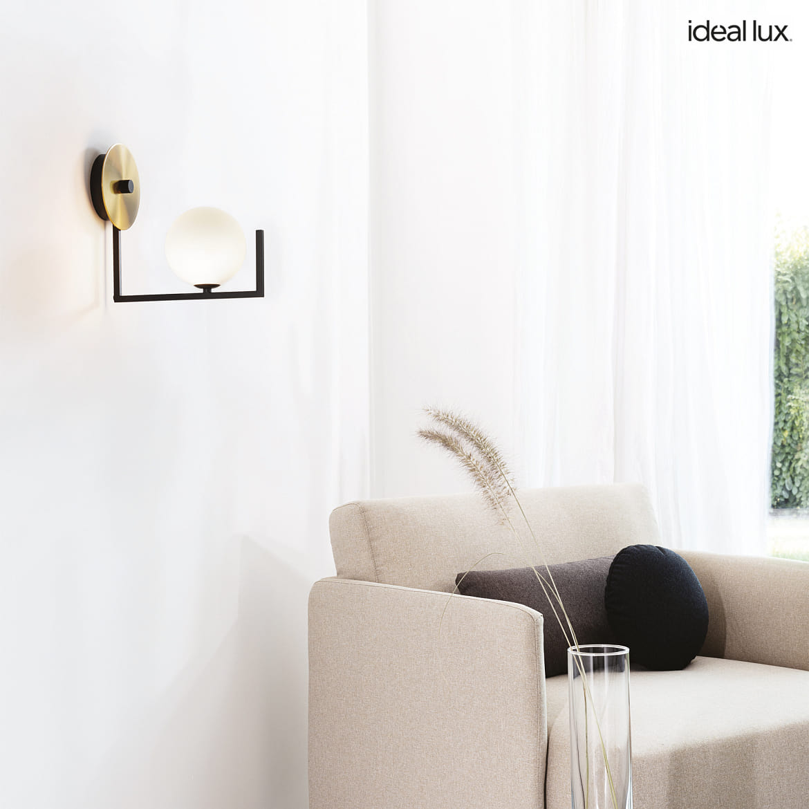 The wall light BIRDS AP1 by Ideal Lux is a striking and decorative light fixture for indoor use. It features a spherical diffuser made of white blown, acid-etched glass, mounted on a narrow, square arm. The wall bracket is equipped with a satin brass disc. Inside the diffuser, there is a socket for G9 high-voltage plug-in lamps.