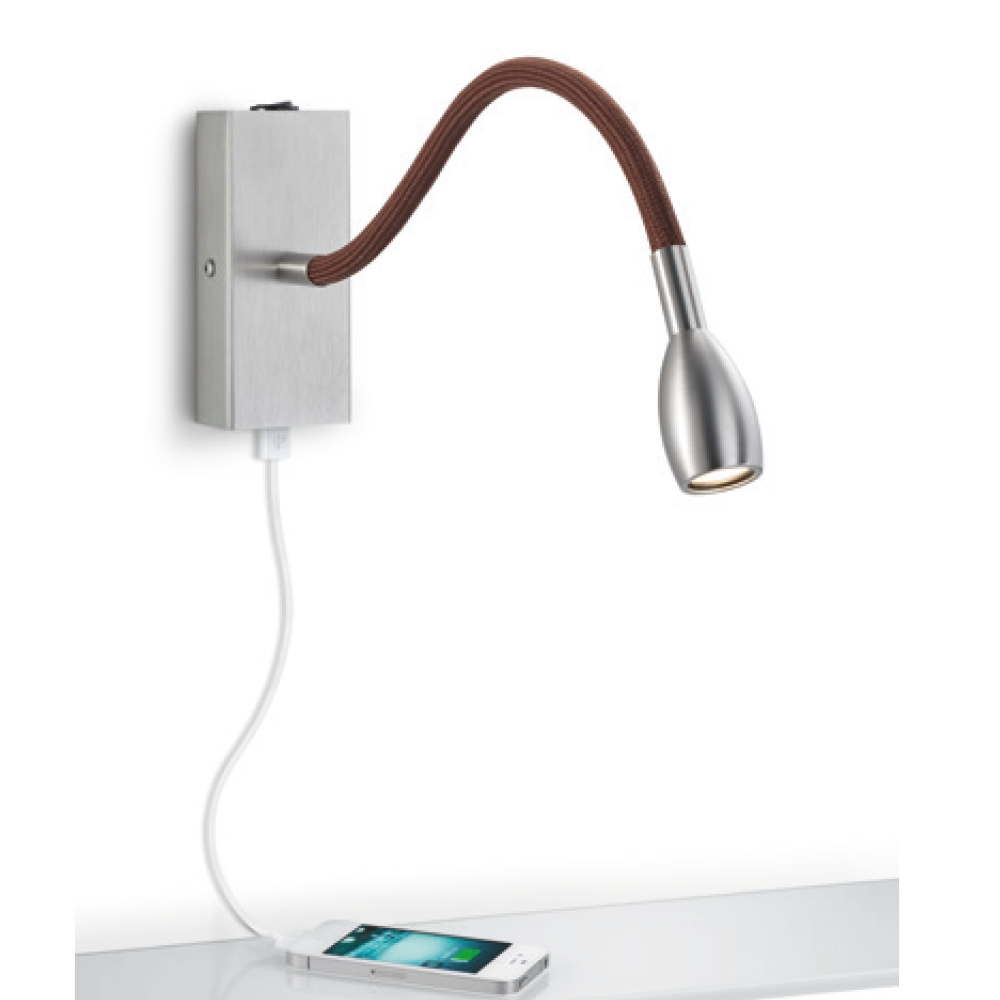 Wandarmatuur ASTA met schakelaar, met flexibele arm, opbouwversie, met USB-oplaadfunctie IP20, bruin, nikkel mat