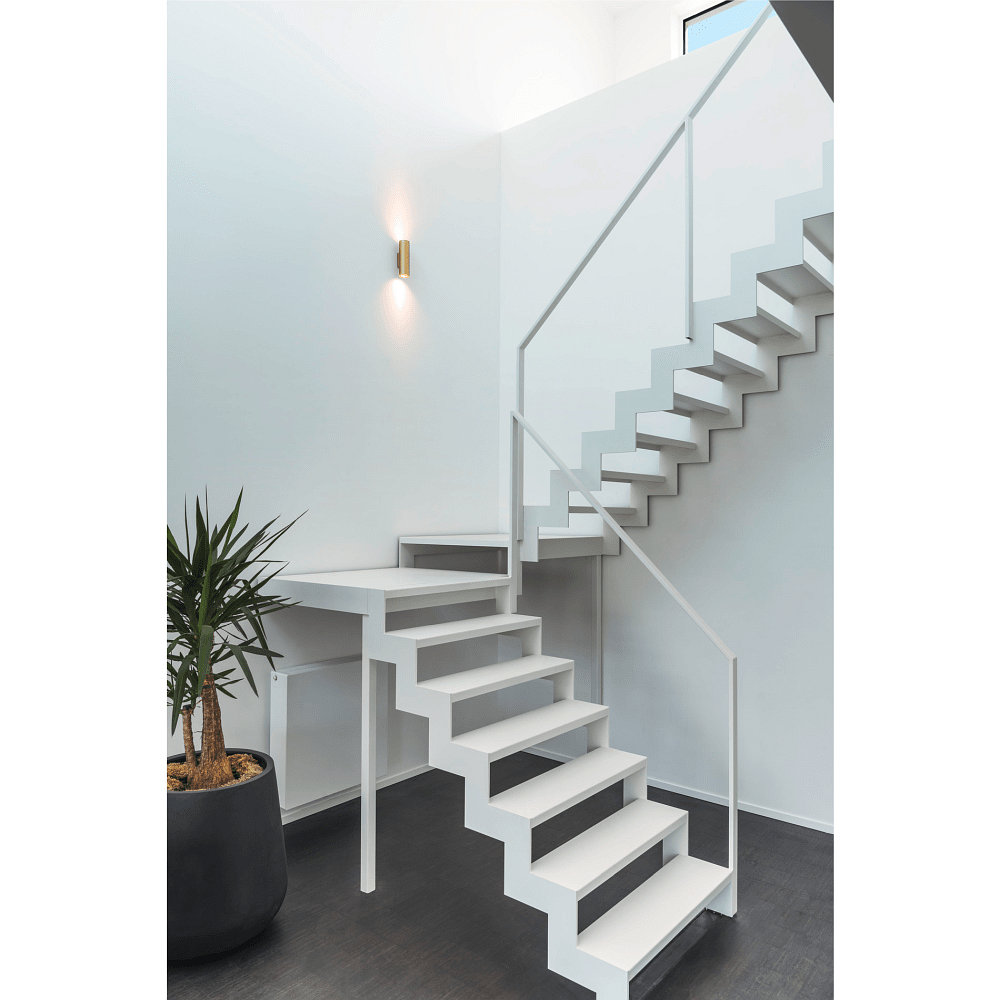 De wandlamp ENOLA_B UP/DOWN is een elegante en moderne binnenverlichting. Met een hoogte van 22 cm en een diameter van 6,8 cm past hij perfect in elke kamer. De wandlamp is gemaakt van hoogwaardig aluminium en staal en is verkrijgbaar in de kleur messing.